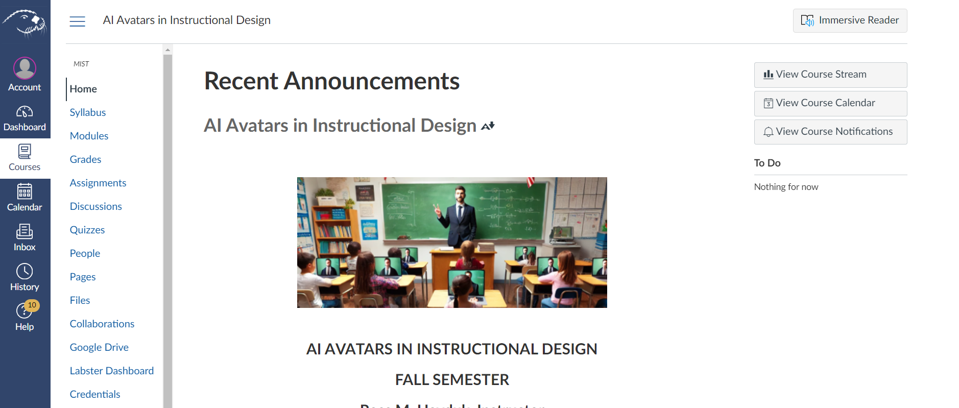 SAMPLE AI AVATARS COURSE BUILT IN CSUMB'SĀ CANVAS LEARNING MANAGEMENT SYSTEM.